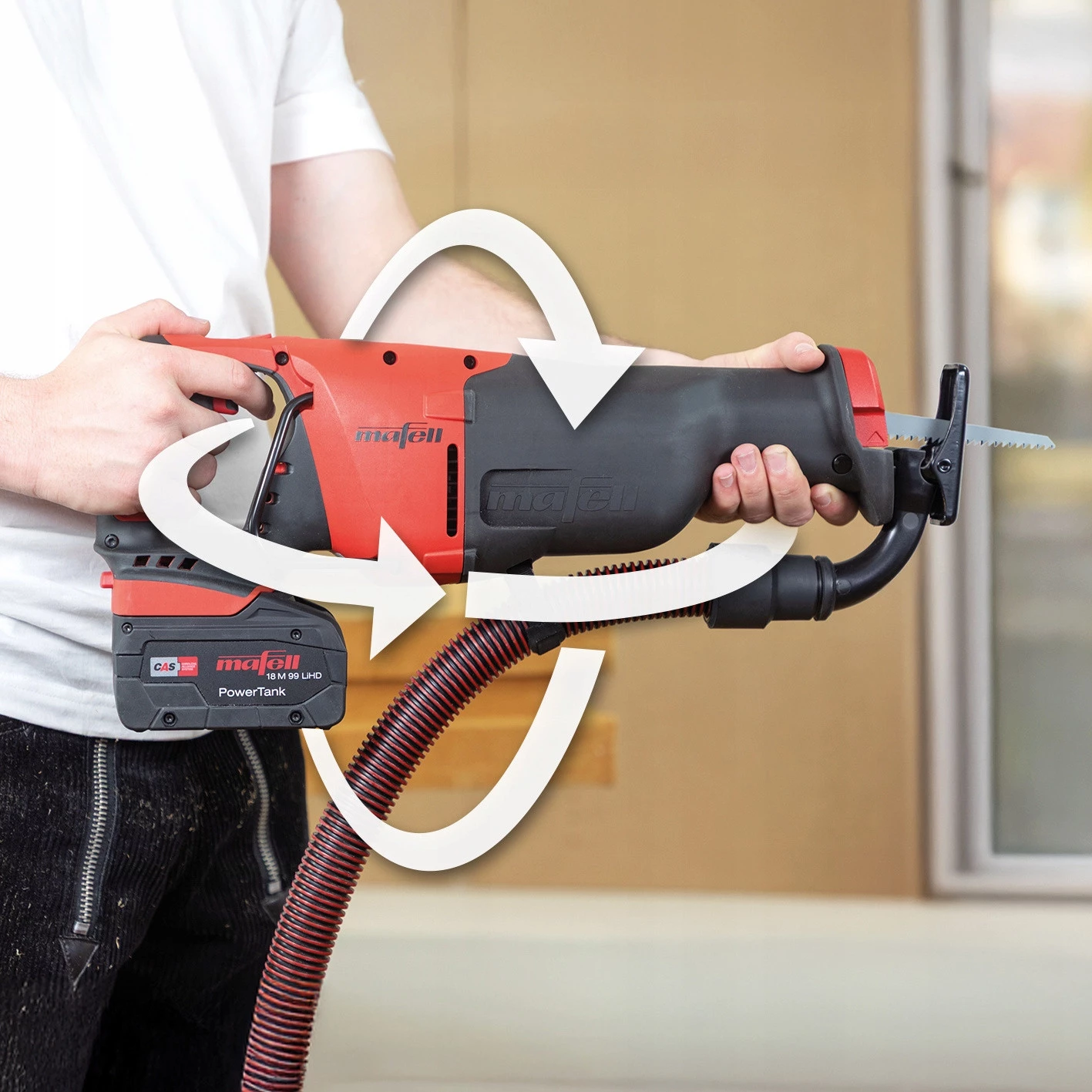 - Wszechstronny Uchwyt Brzeszczotu: Uniwersalny uchwyt umożliwia obrócenie brzeszczotu o 180°, co znacznie ułatwia cięcie w pozycjach odwróconych lub nad głową.