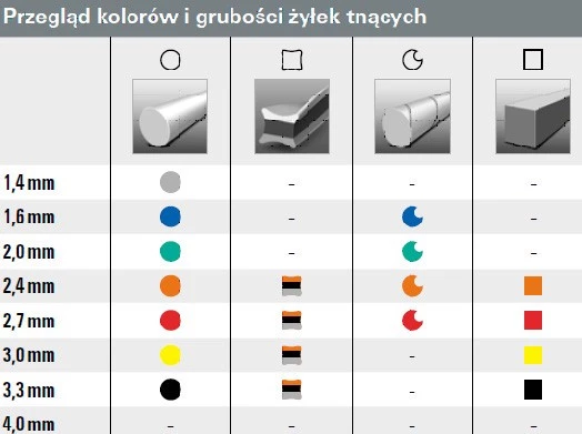 Żyłki tnące STIHL, wykonane z wytrzymałych materiałów. Różne kolory żyłek przyporządkowane do odpowiednich grubości.