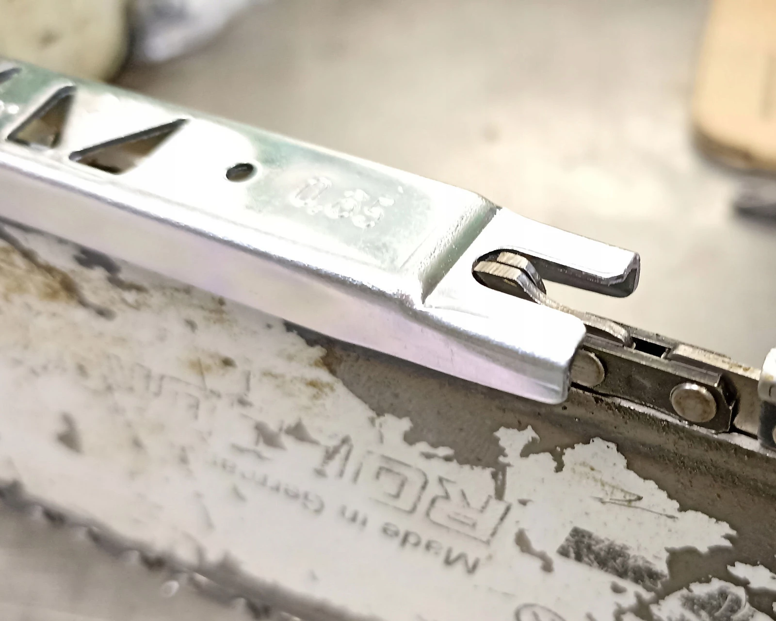 • Czyszczenie Prowadnicy: Wyposażony w specjalny haczyk do łatwego i skutecznego czyszczenia rowka prowadnicy oraz otworów olejowych z wiórów i zanieczyszczeń.