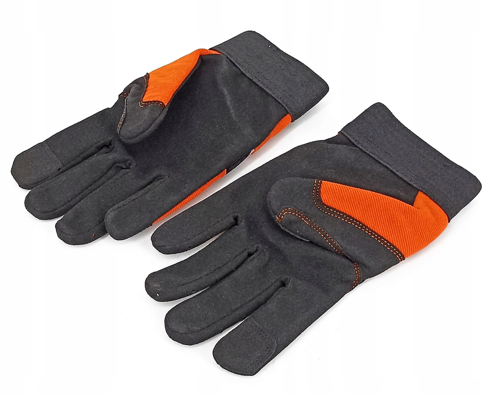 - Pewny Chwyt Narzędzia: Wewnętrzna część dłoni, wykonana z czarnej skóry syntetycznej, została zaprojektowana tak, aby zapewnić pewny i stabilny chwyt na uchwytach pilarek, kos, nożyc i innych narzędzi, co zwiększa kontrolę i bezpieczeństwo pracy.