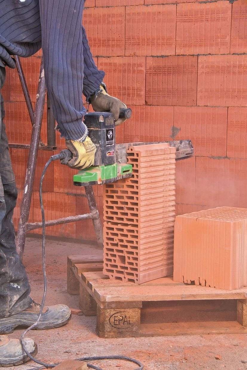 - Solidna, trwała konstukcja z mocnym silnikiem do przemysłowych zastosowań – duża szybkość cięcia prostego jak i skośnego w cegłach dziurawkach nie stanowi problemu