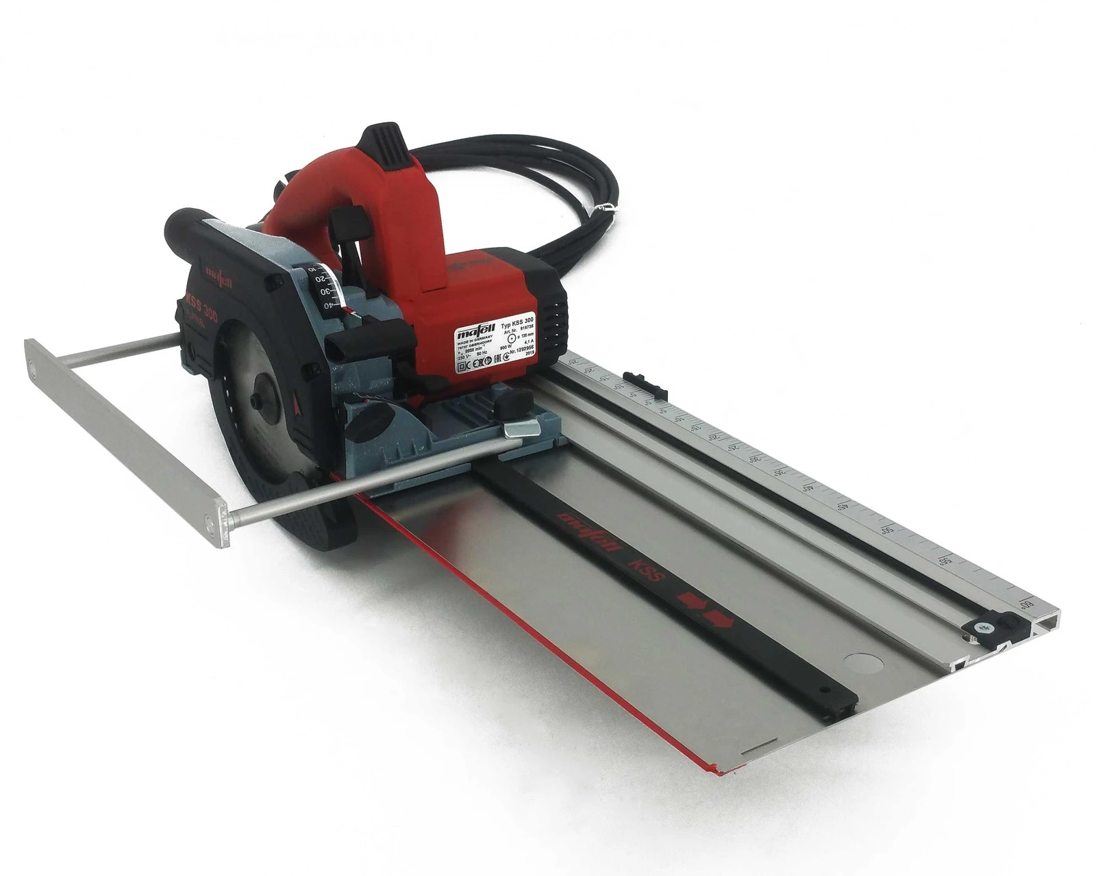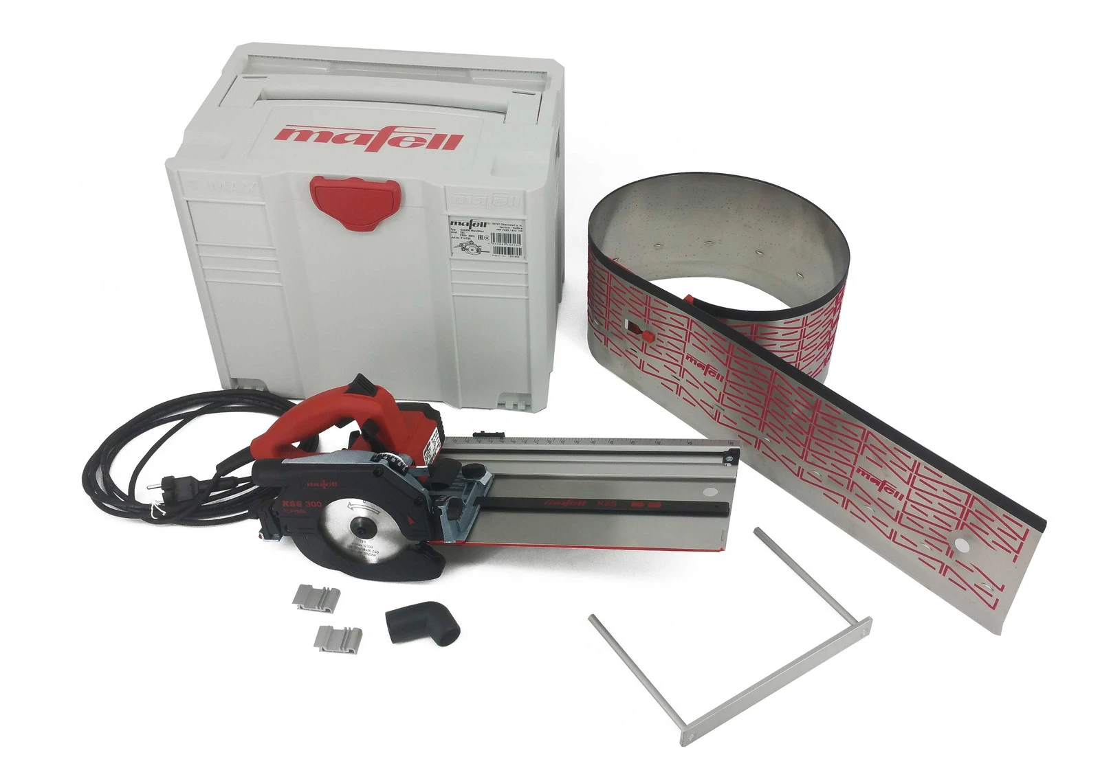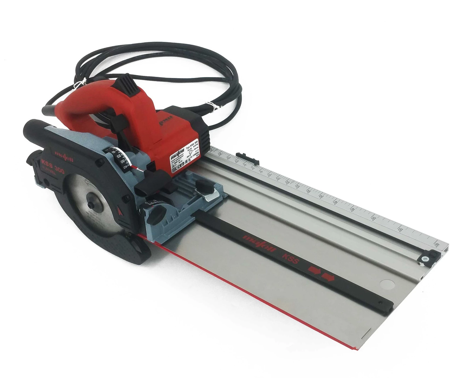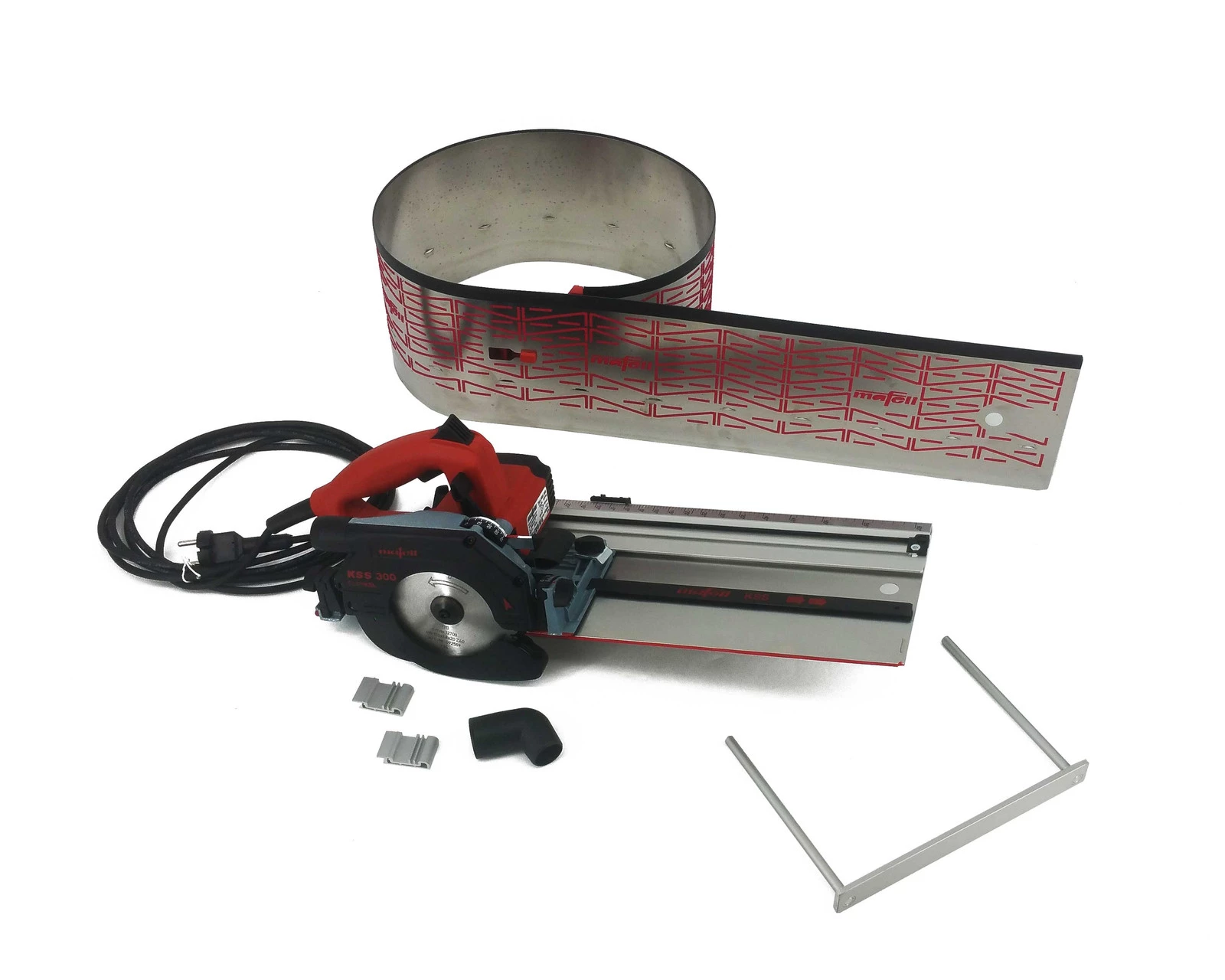 Zintegrowana prowadnica z pilarką KSS tworzą jedną maszynę, którą można obsługiwać tylko jedną ręką. Jest to pełny system do cięcia przekrojowego.