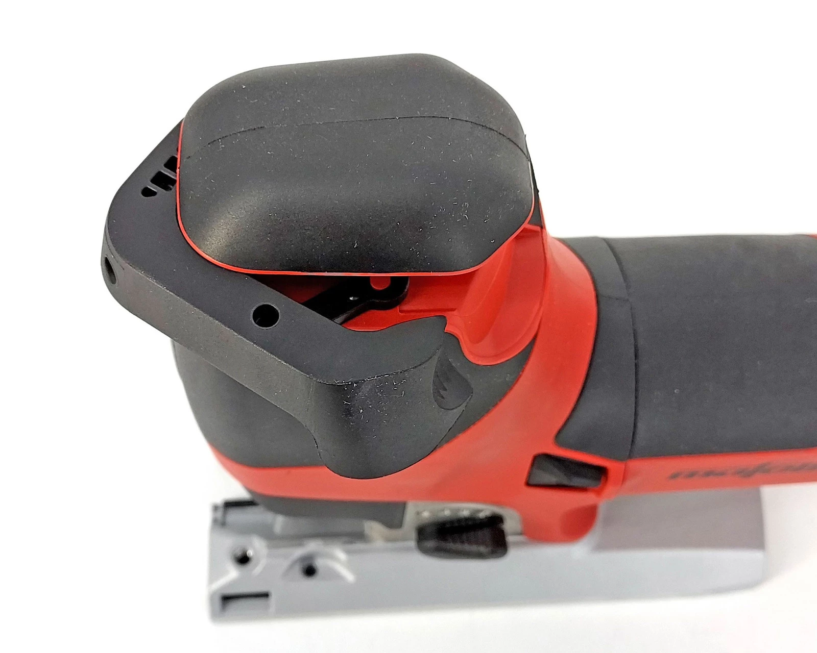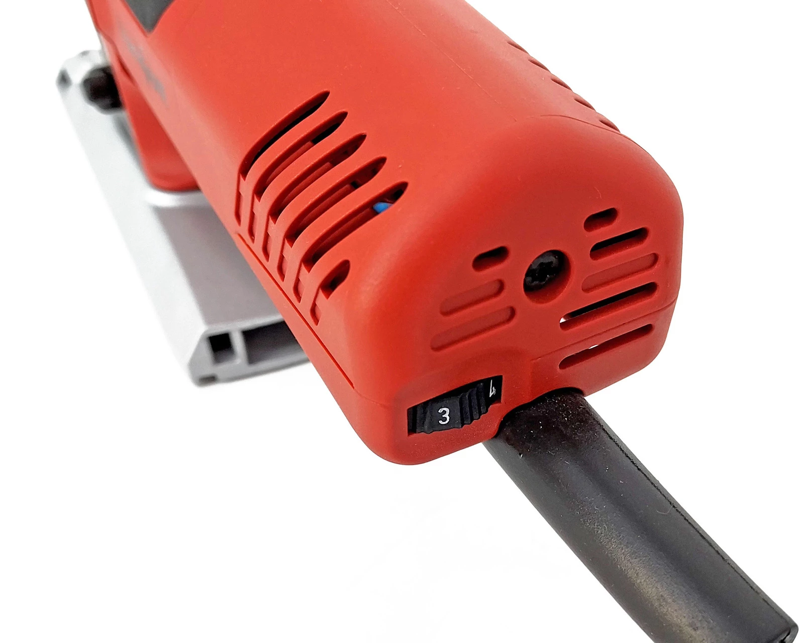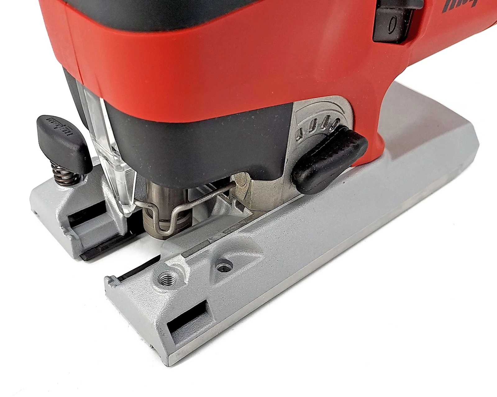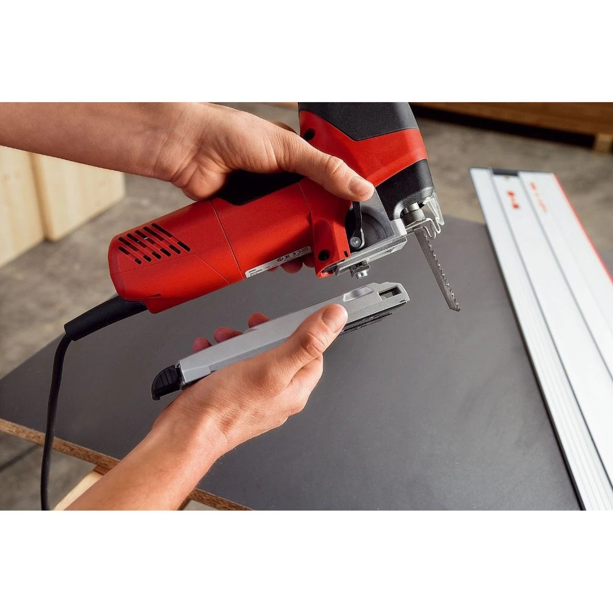 Wyrzynarka wyposażona jest w wytrzymałą stopę ze zintegrowanym kanałem odsysającym, co zapewnia czystość miejsca pracy. Beznarzędziowy mechanizm wymiany stopy gwarantuje jej szybkie i dokładne mocowanie pod kątem prostym, co jest kluczowe dla precyzji cięcia.