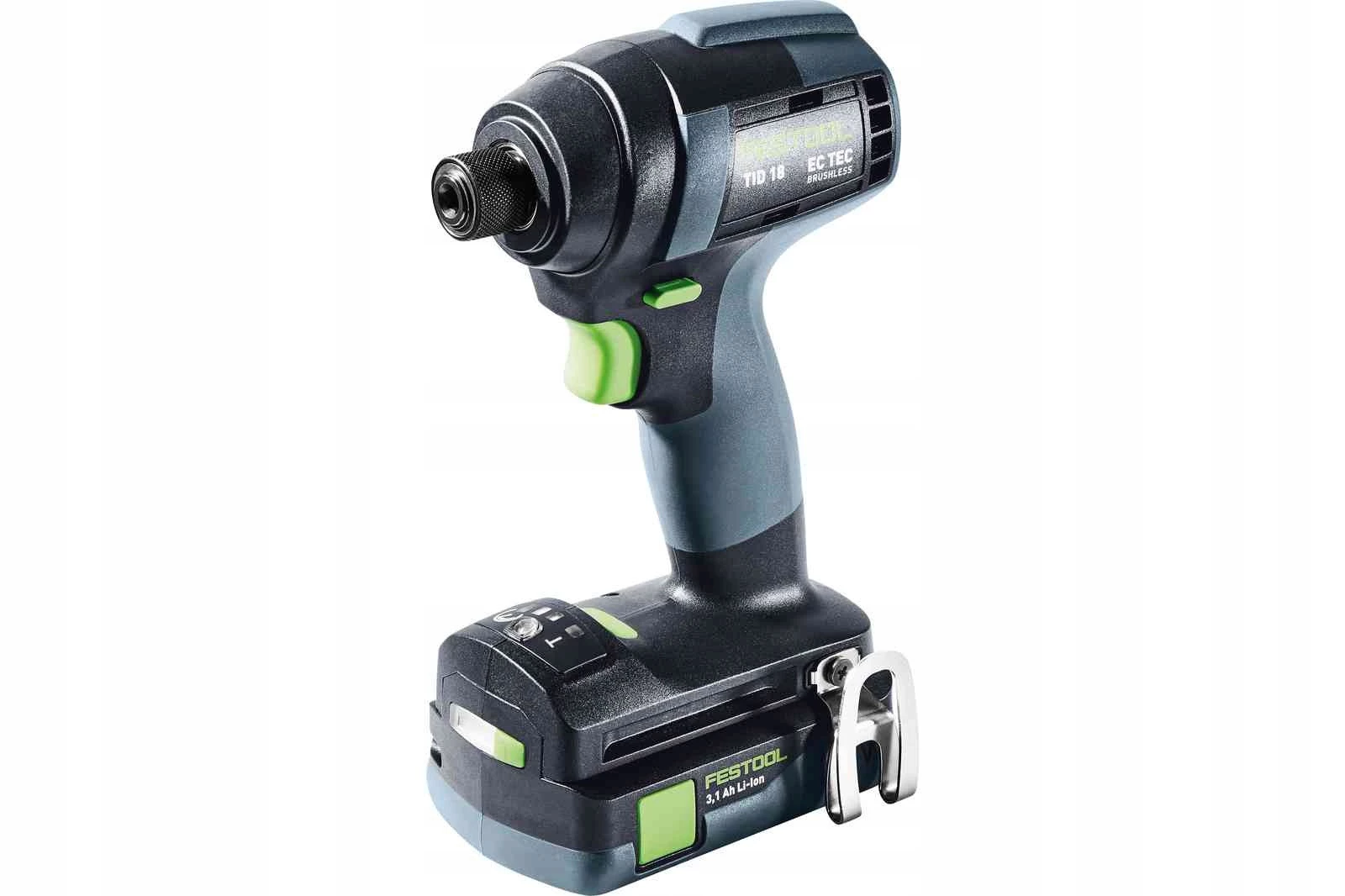 - Kompaktowa zakrętarka udarowa Festool TID 18 C z silnikiem bezszczotkowym EC-TEC. Moment obrotowy 180 Nm, 3 biegi oraz tryb T do wkrętów samowiercących. Mechanizm udaru stycznego chroni nadgarstek. Zestaw z 2 akumulatorami 3.1Ah i ładowarką.