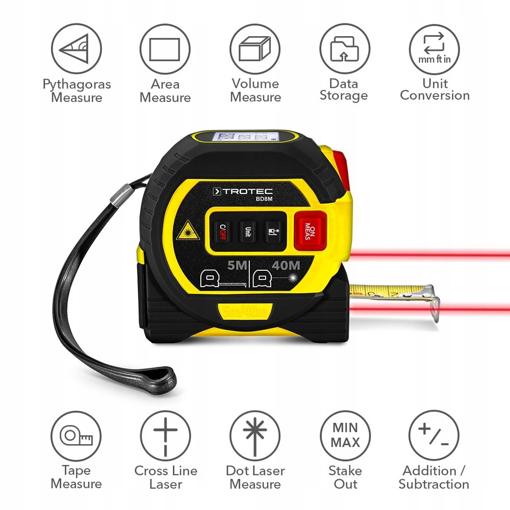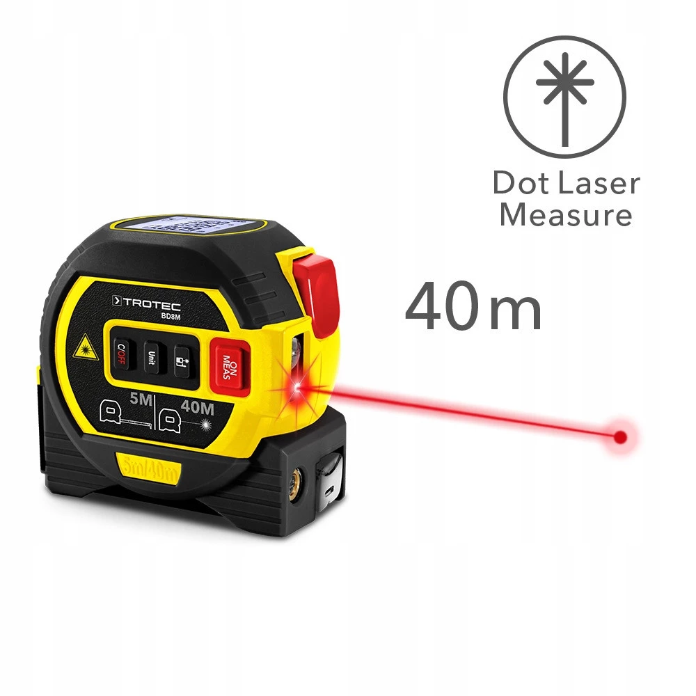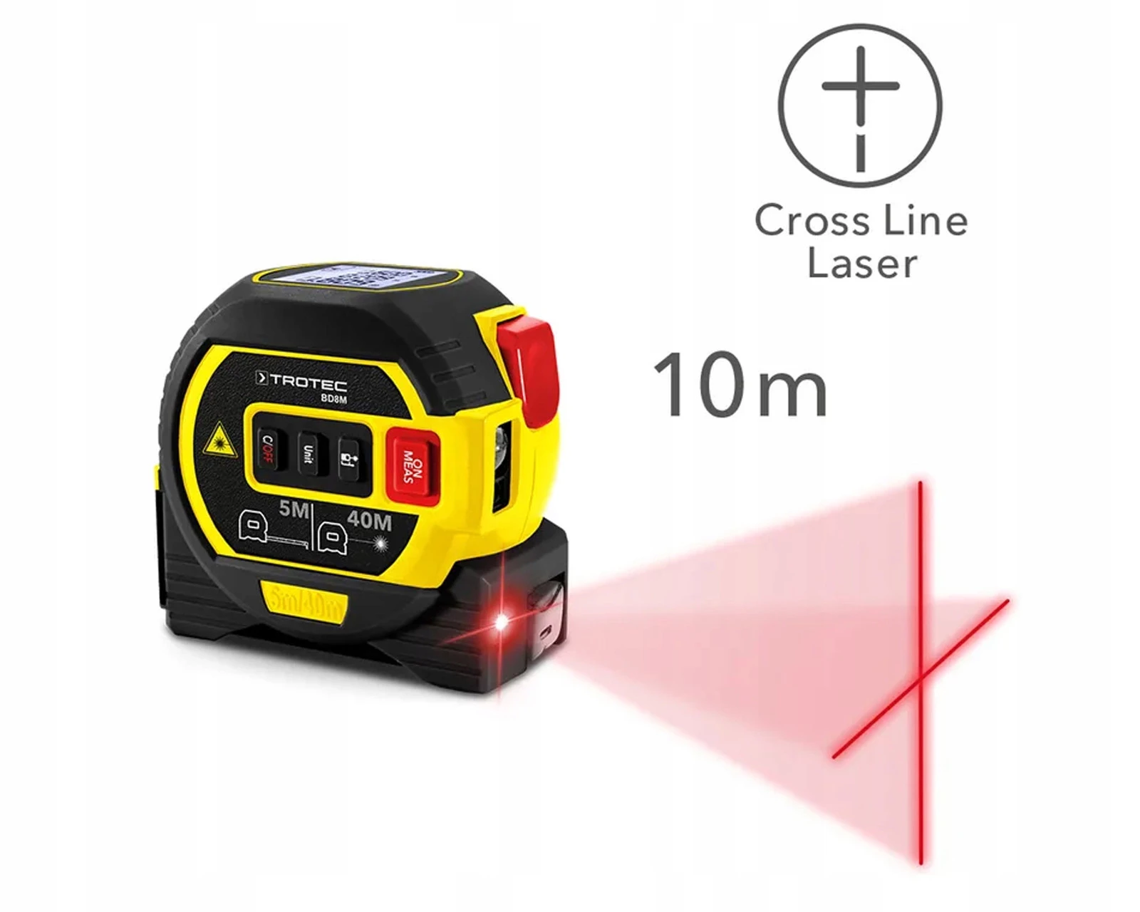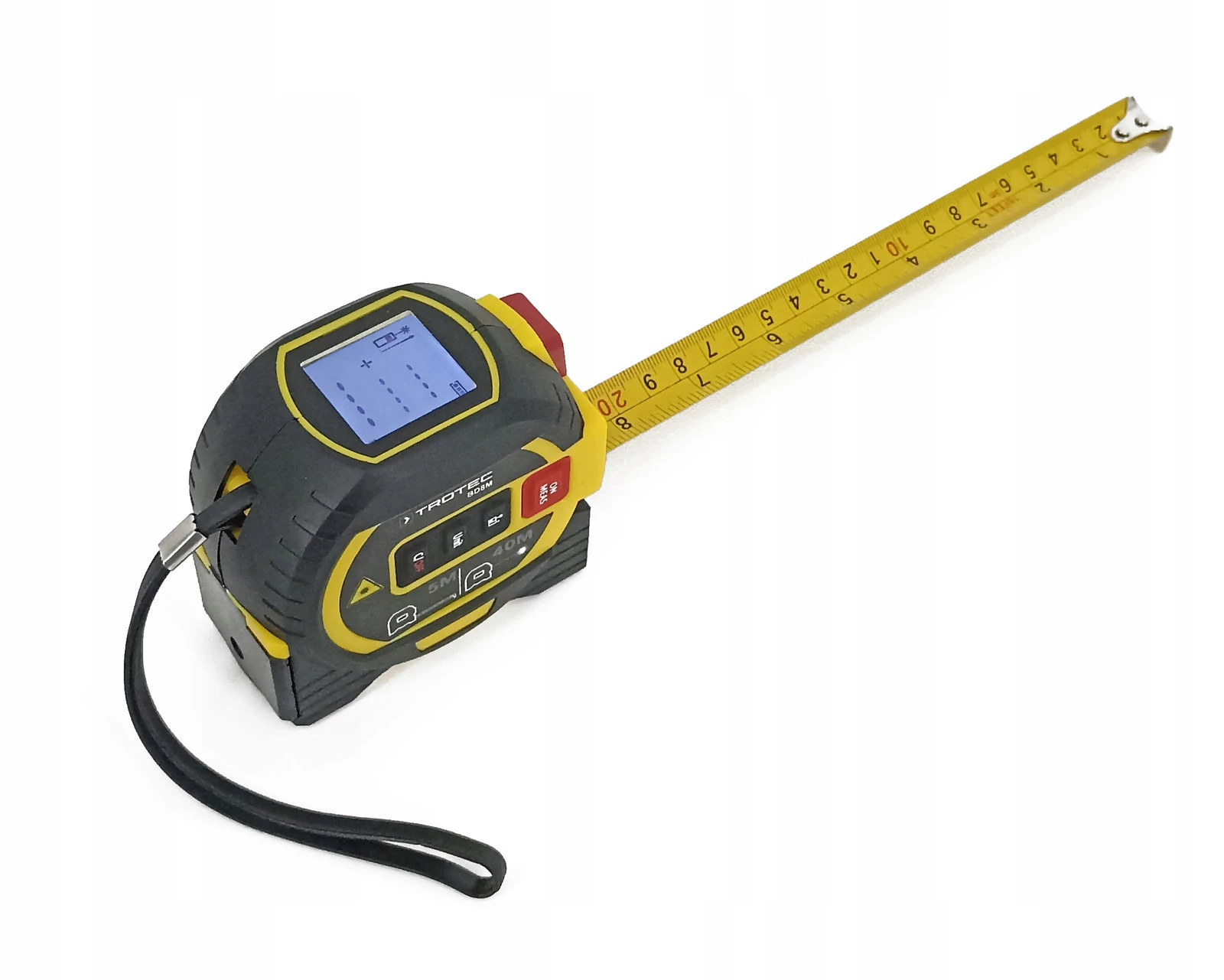 - Wielofunkcyjne narzędzie pomiarowe Trotec 3w1. Łączy w sobie tradycyjną miarę zwijaną 5m, dalmierz laserowy o zasięgu 40m (z funkcjami powierzchni i kubatury) oraz laser krzyżowy o zasięgu 10m. Niezbędne narzędzie na każdej budowie i w warsztacie.