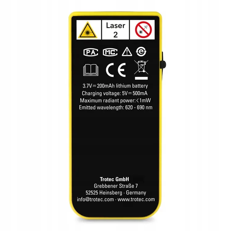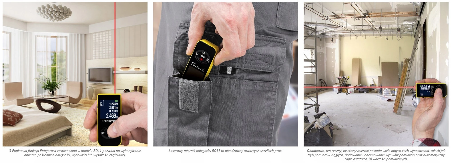 - Miniaturowy dalmierz laserowy Trotec BD11 o zasięgu do 30m. Mierzy odległość, powierzchnię i objętość, posiada funkcję Pitagorasa. Kompaktowy i lekki (24g), z wbudowanym akumulatorem ładowanym przez USB. Odporna obudowa w klasie IP54.