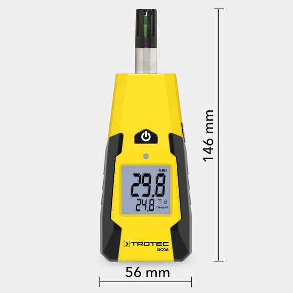- Kompaktowy termohigrometr Trotec BC06 do pomiaru temperatury, wilgotności względnej, punktu rosy i temperatury termometru mokrego. Prosta obsługa jedną ręką, podświetlany wyświetlacz z funkcją MIN/MAX. Niezbędny do diagnostyki klimatu.
