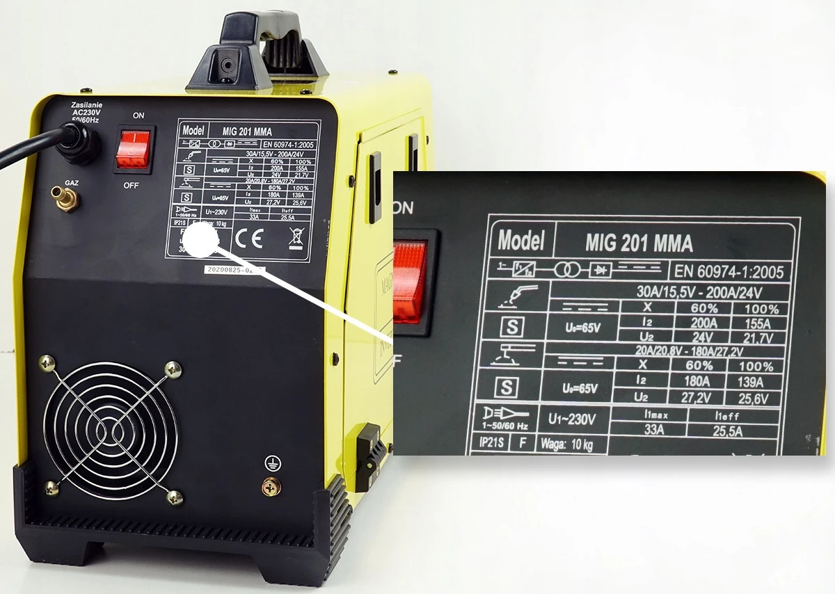 - Maksymalny prąd spawania: 200A (MIG/MAG) 180A (MMA/TIG)