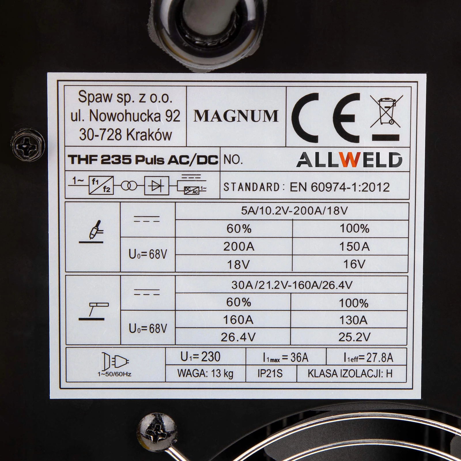 SPAWARKA TIG AC DC MAGNUM THF 235P PULS MMA 230V 200A ALUMINIUM IGBT HF