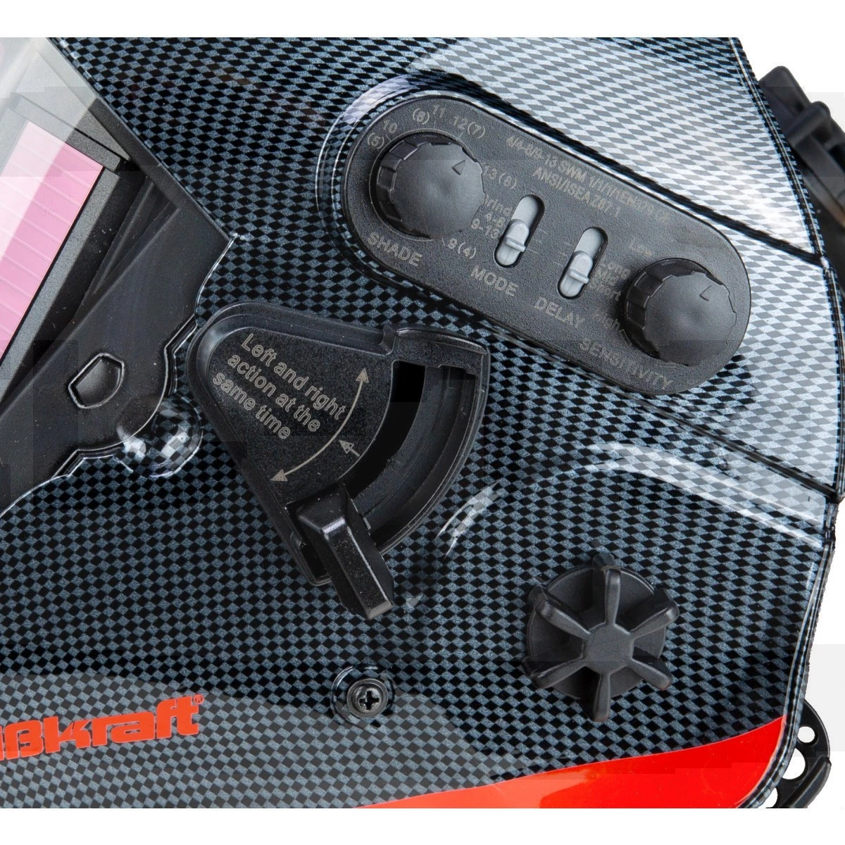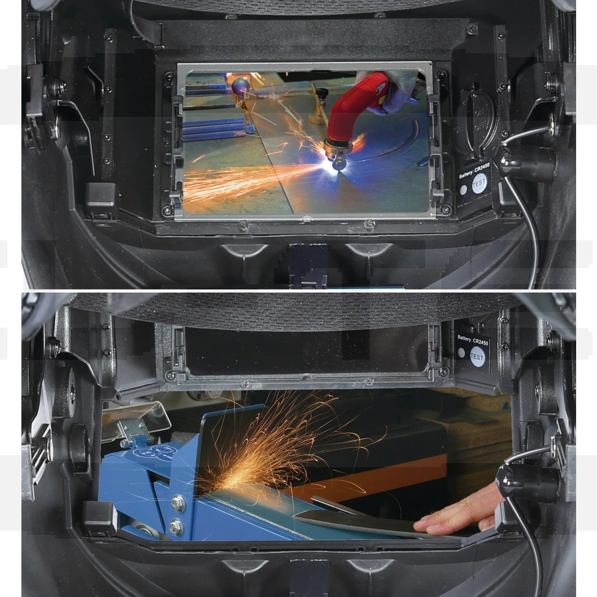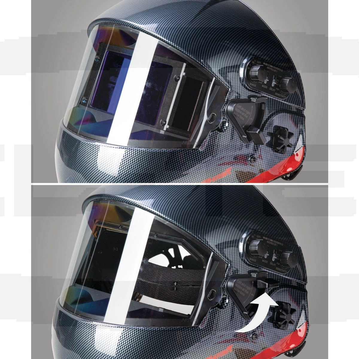 - Flip-Up System: Filtr samościemniający jest chowany w hełmie, np. możliwość patrzenia bezpośrednio przez przeźroczysty poliwęglan ochronny podczas szlifowania