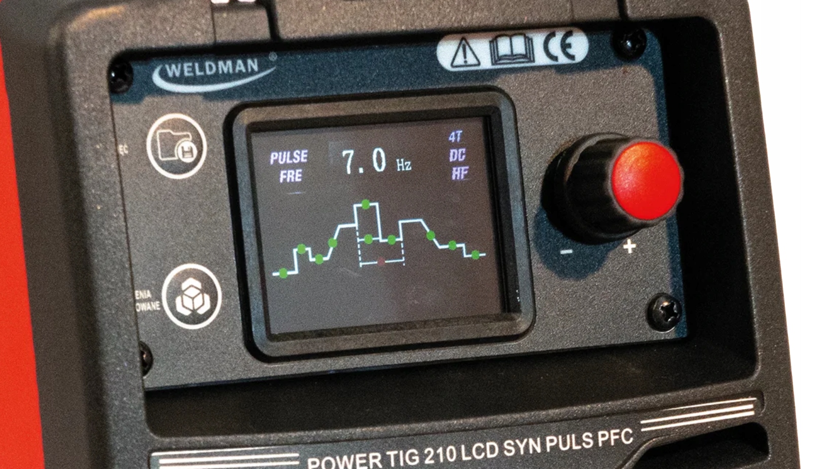 Ustawianie wszelkich parametrów urządzenia odbywa się na panelu sterującym, na którym umieszczone jest wielofunkcyjne pokrętło i wyświetlacz ciekłokrystaliczny LCD. Powyższe rozwiązanie umożliwia łatwe i szybkie ustawianie oraz odczytywanie wszelkich parametrów spawania.