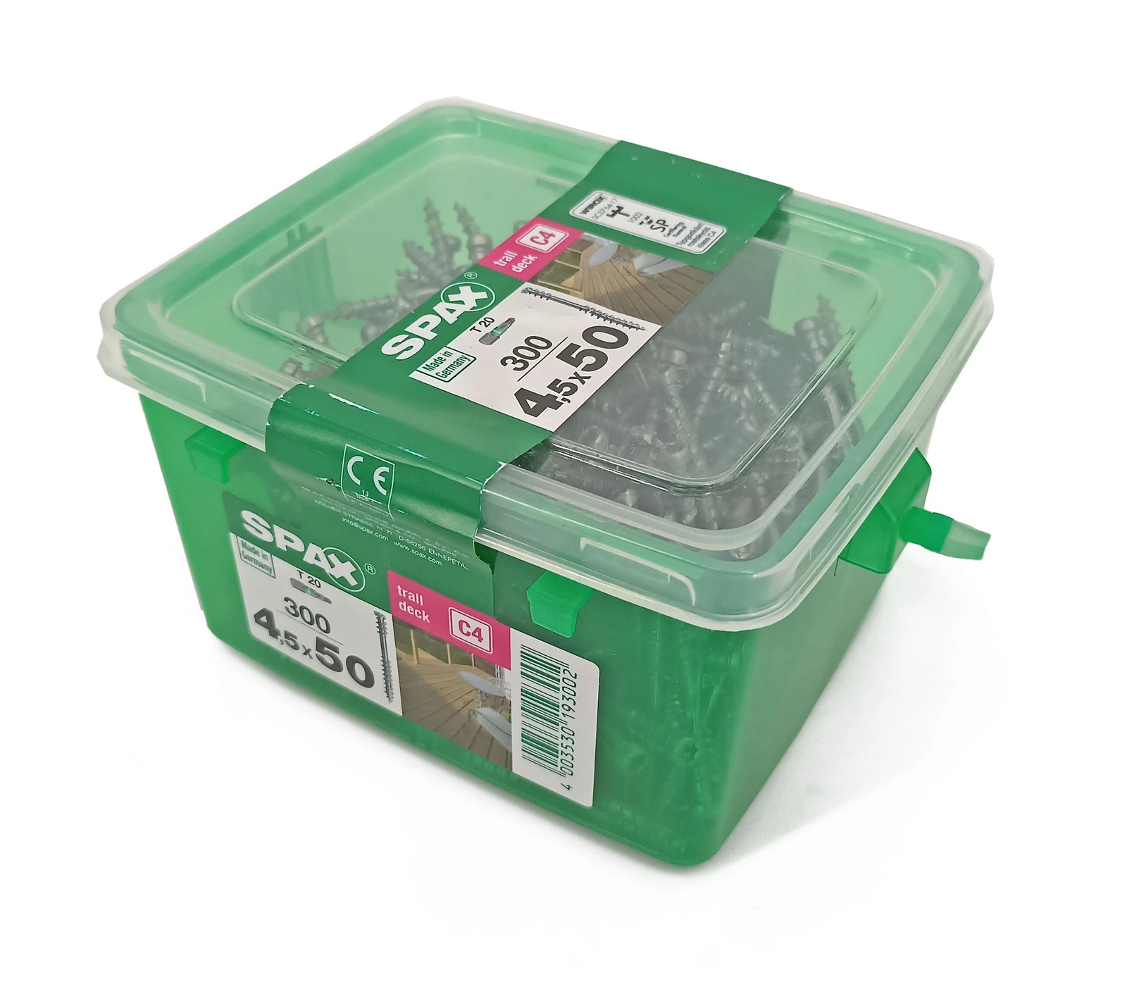 WKRĘT DO DESKI TARASOWEJ SPAX D, ŚR. 4,5 MM, GŁÓWKA CYLINDRYCZNA, GNIAZDO TX 20, GWINT DOCIĄGAJĄCY, SZPIC 4 CUT, POWŁOKA ANTYKOROZYJNA WIROX, DREWNO MIĘKKIE, 300 SZTUK