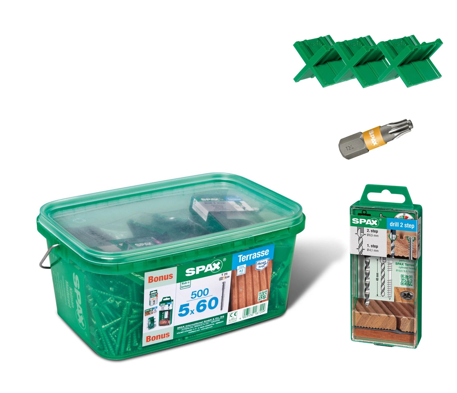 WKRĘT DO DESKI TARASOWEJ SPAX D, ŚR. 5,0 MM, GŁÓWKA CYLINDRYCZNA, GNIAZDO T-STAR PLUS TX 25, GWINT DOCIĄGAJĄCY, SZPIC CUT, AUSTENITYCZNA STAL NIERDZEWNA A2, 500 SZTUK