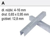 Zszywki typu A, długość nóżki dostępna w zakresie 4-16 mm do wyboru. Szerokość grzbietu 12,8 mm. Wymiar drutu 0,65 x 0,95 mm.