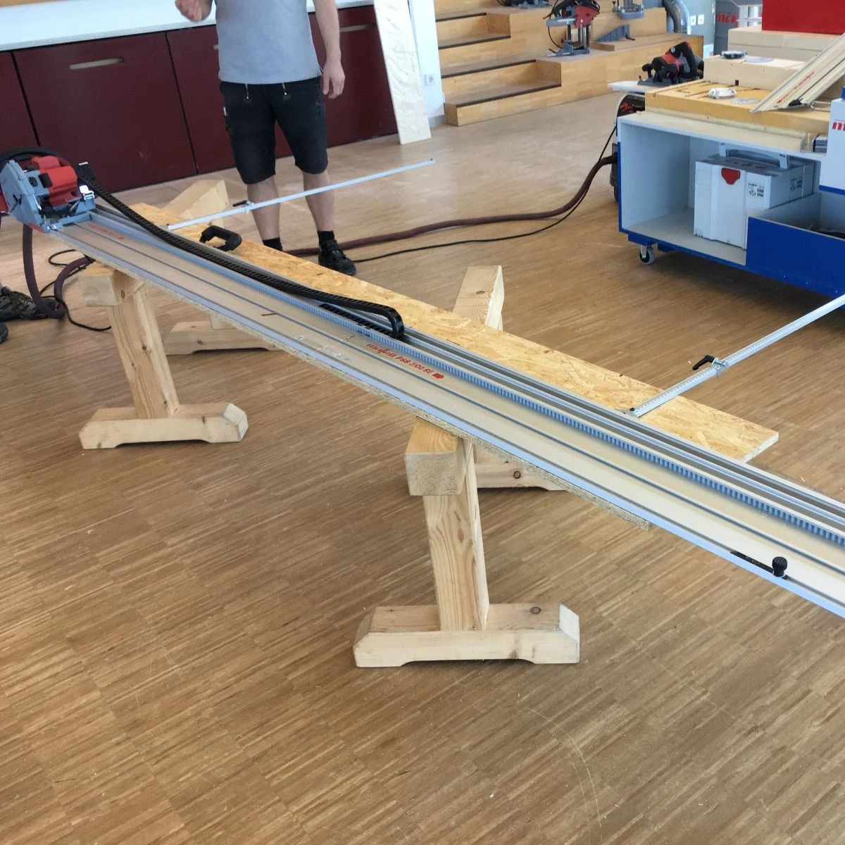 Zderzak poprzeczny Mafell do PSS 3100 SE jest regulowany do długości 1250 mm. Mierzy odległość od boku panelu dla równoległych cięć. Do użycia wymagane są dwa elementy.