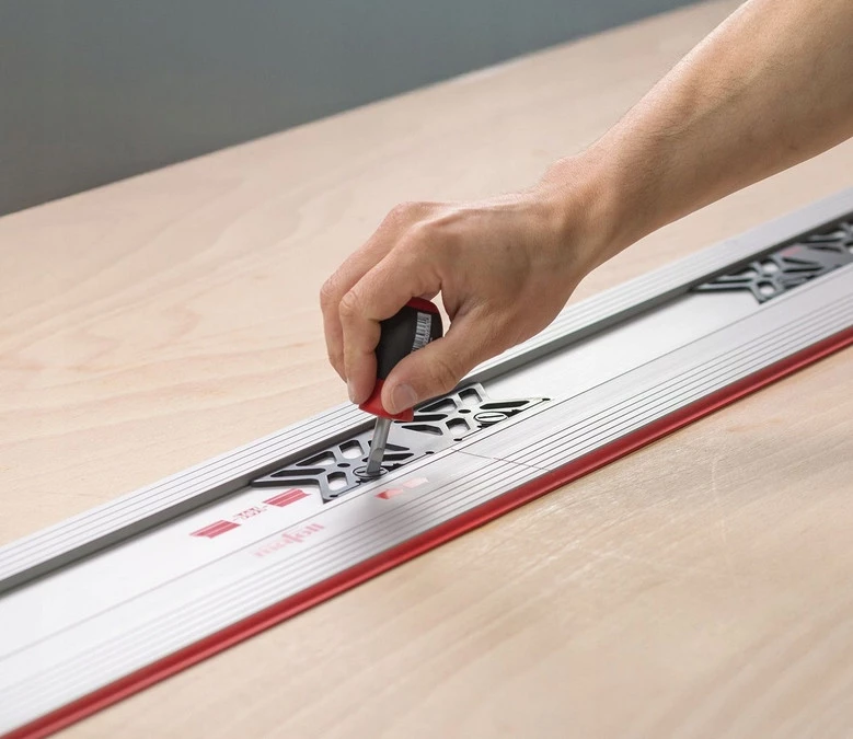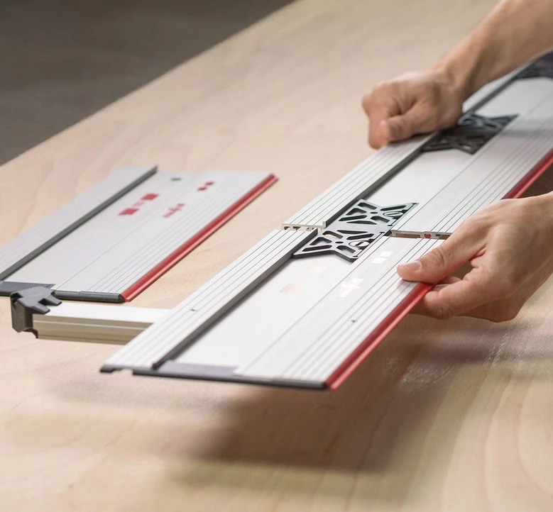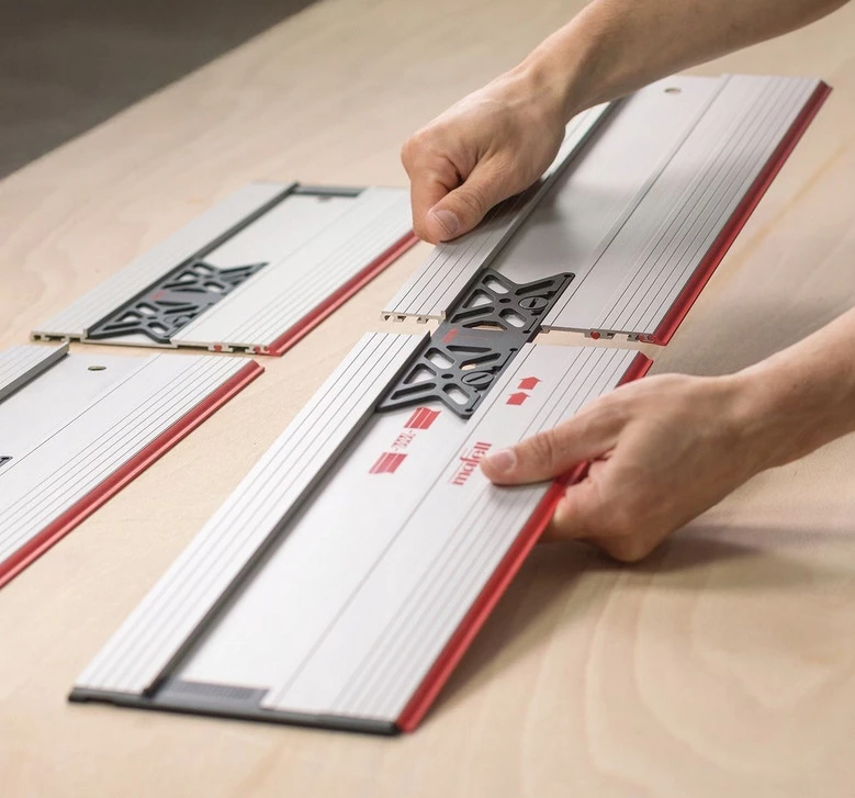 - Modułowa Konstrukcja: System czterech szyn (4 x 37 cm) i trzech samopozycjonujących łączników F-VS2 pozwala na szybki montaż idealnie prostej prowadnicy o długości 1480 mm, niezbędnej do cięcia dużych płyt.