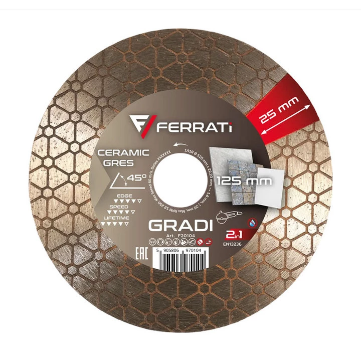 - Dwustronna tarcza diamentowa Ferrati GRADI 125mm (otwór 22,23mm). Umożliwia cięcie, szlifowanie i ukosowanie pod kątem 45°. Segment 25mm po obu stronach tarczy zapewnia wydłużoną żywotność. Do pracy na sucho z gresem, ceramiką i kamieniem.