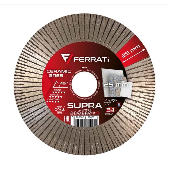 - Wielofunkcyjna tarcza diamentowa Ferrati Supra 125mm (otwór 22,23mm). Umożliwia cięcie proste, szlifowanie krawędzi i ukosowanie płytek pod kątem 45°. Segment o wysokości 25mm. Do pracy na sucho z gresem, ceramiką i kamieniem.