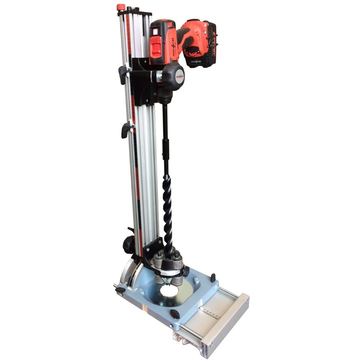 Modele S stojaków wiertarskich wyposażone są w płynną regulację kąta nachylenia +/- 45° w obu kierunkach wg skali oraz blokadę na 0°. Wierzchołek wiertła służy jako oś obrotu.