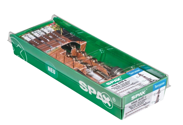 Specjalne dwustopniowe wiertło marki SPAX, które przy jednym wierceniu wykonuje podwójny otwór. Pierwszy o średnicy 6 mm, drugi na główkę wkręta o średnicy 9 mm. Możliwość regulacji długości części roboczej przy pomocy dołączonego do zestawu klucza imbusowego.