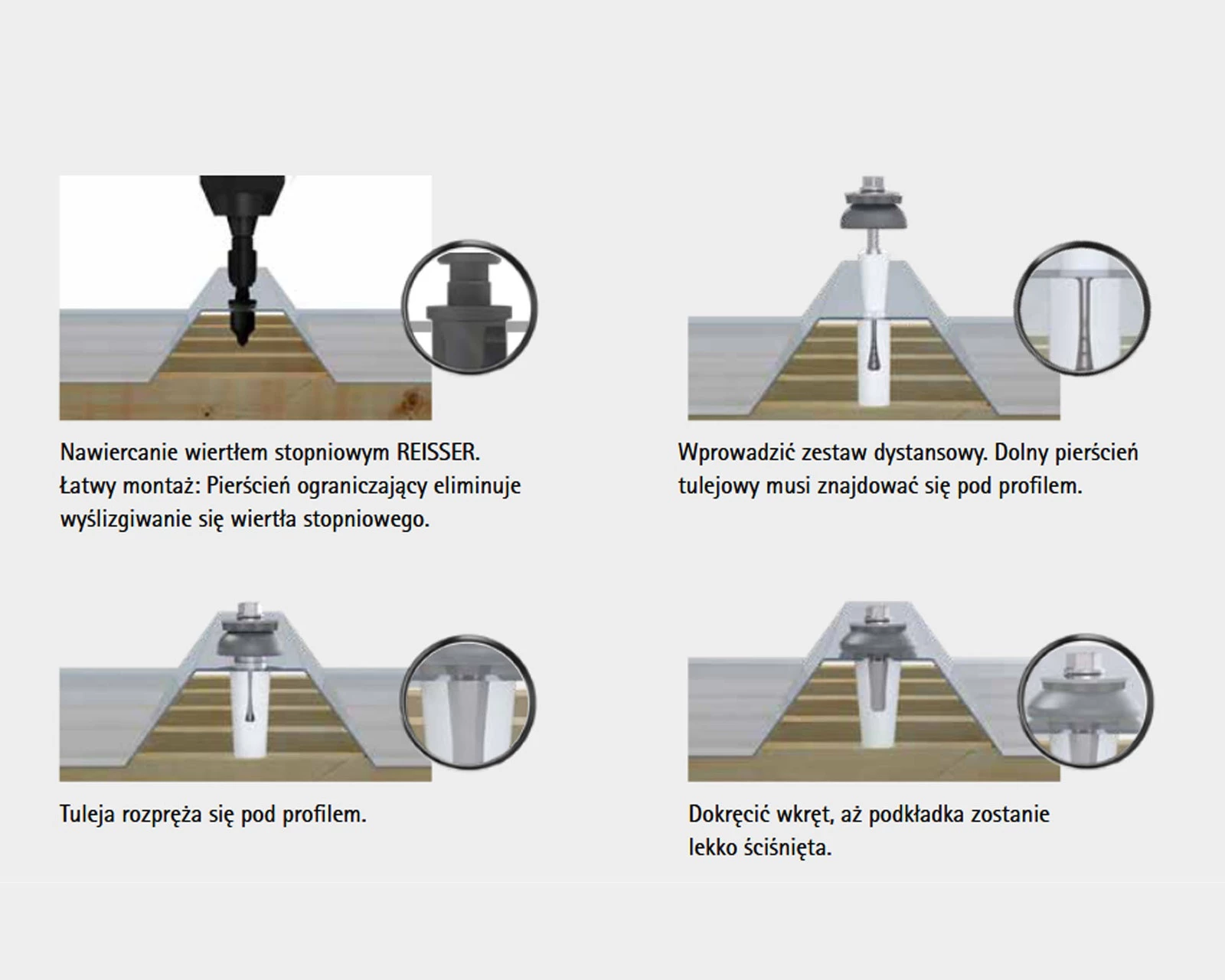 Zastępuje tradycyjne podkładki pod płyty faliste oraz trapezowe (wysokość 18 mm, 30, 35, 40, 45 oraz 50mm).
