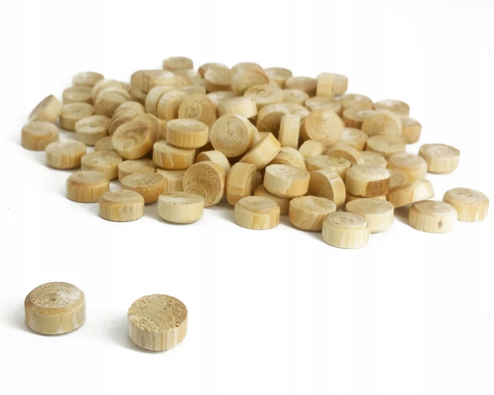 Zestaw fleków gałęziowych (nazywanych również sękami lub zaprawkami) wykonanych z drewna świerkowego. Jest to niezbędny element w każdym warsztacie stolarskim i ciesielskim, służący do precyzyjnego i estetycznego maskowania wad drewna lub ubytków powstałych podczas obróbki.