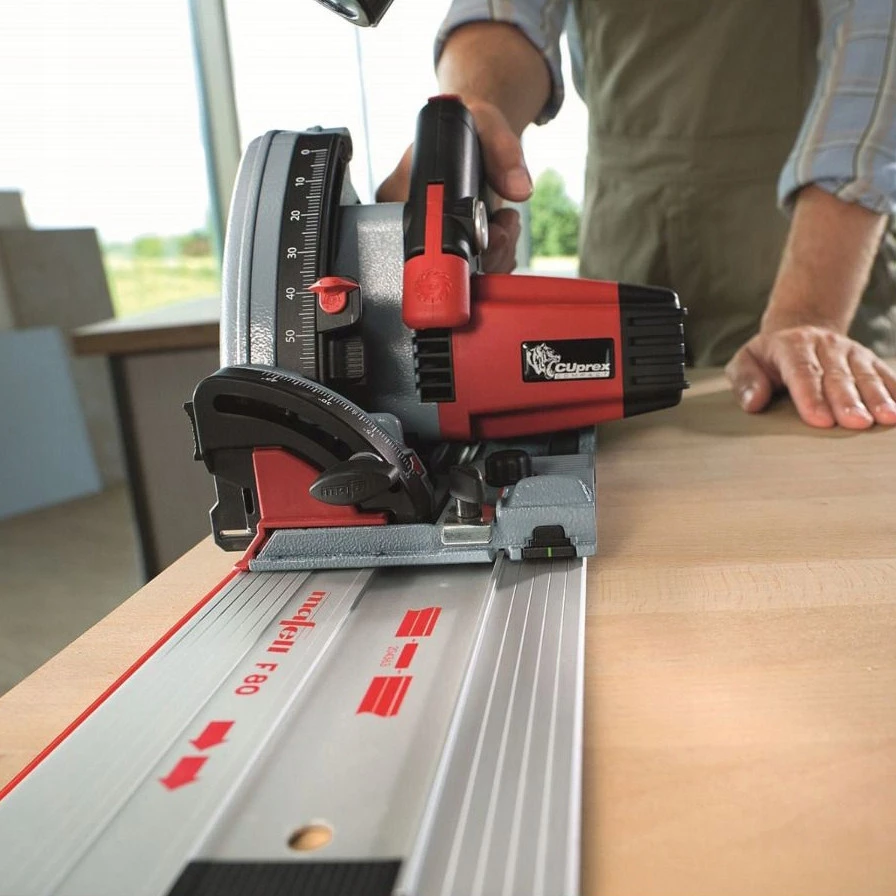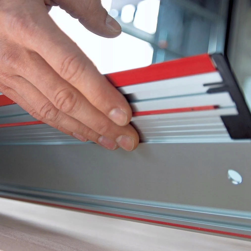• System Prowadzenia z Szyną F 160: Dołączona do zestawu szyna prowadząca o długości 1,6 m umożliwia wykonywanie idealnie prostych i powtarzalnych cięć na długich elementach.
