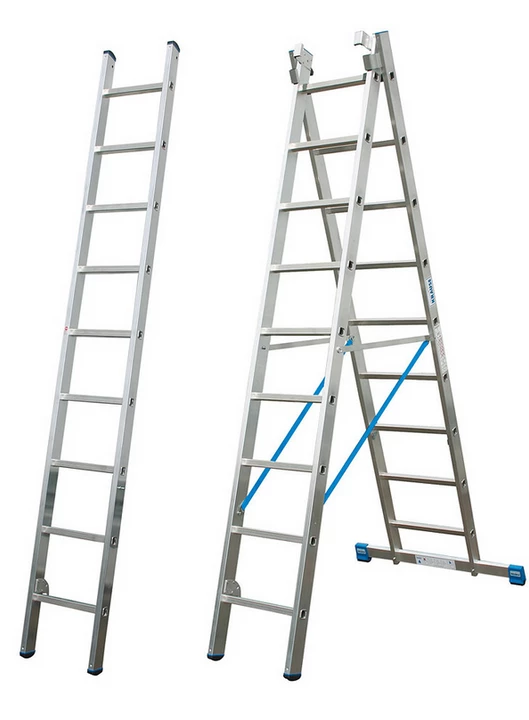 Większa stabilność dzięki stabilnym, obejmującymi podłużnice prowadnicom. Drabinę możemy rozłożyć na 2 części: drabinę rozstawno - przystawną i pojedynczy element przystawny.