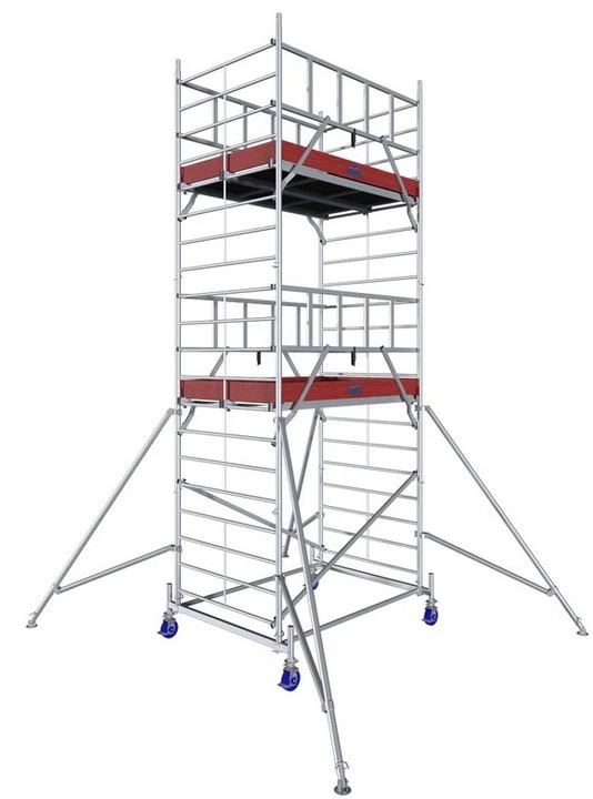 Rusztowanie wyposażone zostało w 2 wygodne podesty robocze z czego jeden z otwieraną klapą umożliwiającą przejście na wyższą kondygnację. Konstrukcja podestów wykonana została ze spawanych profili aluminiowych od wierzchu pokrytych sklejką, z wodoodporną, antypoślizgową warstwą żywicy fenolowej. Dzięki temu znacznie ograniczone zostało ryzyko poślizgnięcia się i upadku w czasie pracy na rusztowaniu. Łatwy montaż podestów do szczebli rusztowania, zapewniają zestawy zabezpieczające z motylkiem dokręcanym bez użycia narzędzi.