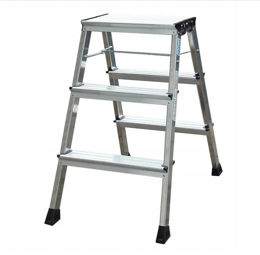 Schodki aluminiowe z możliwością wchodzenia z obu stron o dużej powierzchni roboczej 200 x 350 mm oraz profilowane stopnie o głębokości 80 mm zapewniają bezpieczne wchodzenie i wygodne użytkowanie drabiny