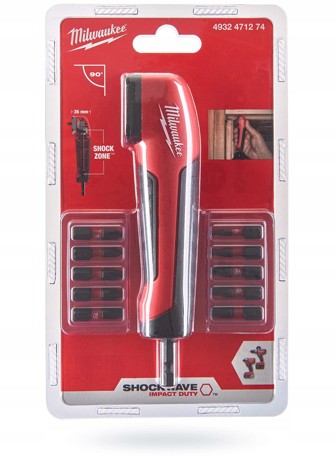 Głowica kątowa 90° udarowa 226 Nm 36mm 1/4" hex Milwaukee 4932471274 + 10 bitów SHOCKWAVE