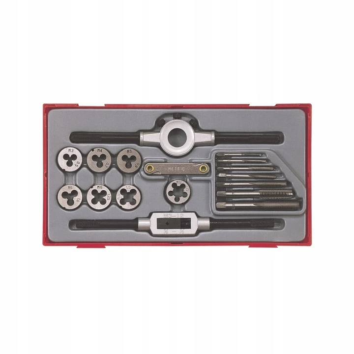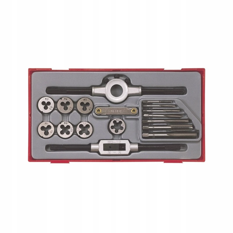 17-częściowy zestaw zawierający jeden gwintownik i jedną narzynkę dla każdego wymiaru, a także klucz gwintownikowy, trzpień narzynki i miernik podziałki śrub. Nadaje się do naprawy gwintów. Zestaw jest dostarczany w unikalnej tacy Teng Tools TC i może być używany samodzielnie lub jako część systemu sterowania Teng Tools TC. Taca ma zdejmowaną pokrywę na zawiasach i przegubowe łączniki które umożliwiają połączenie różnych tac TC i używanie ich jako tac w skrzynkach narzędziowych i szafkach Teng Tools.