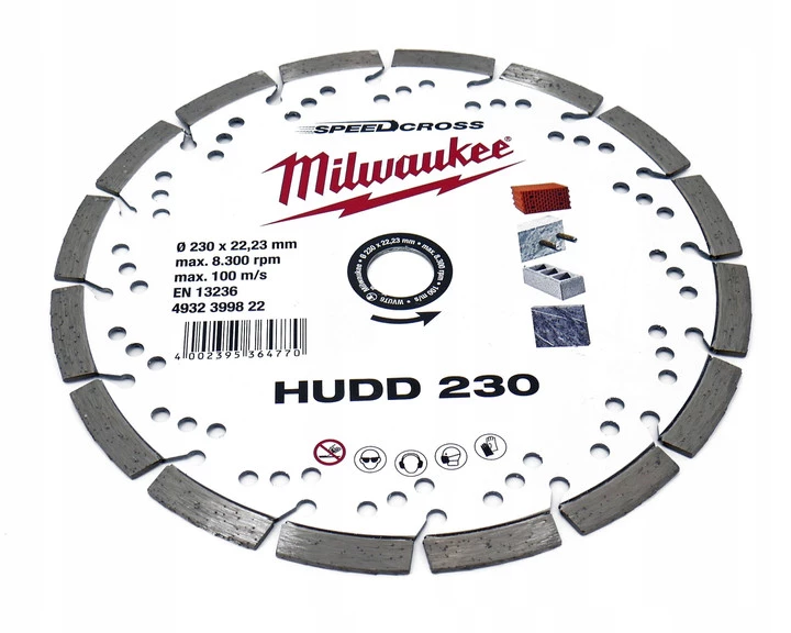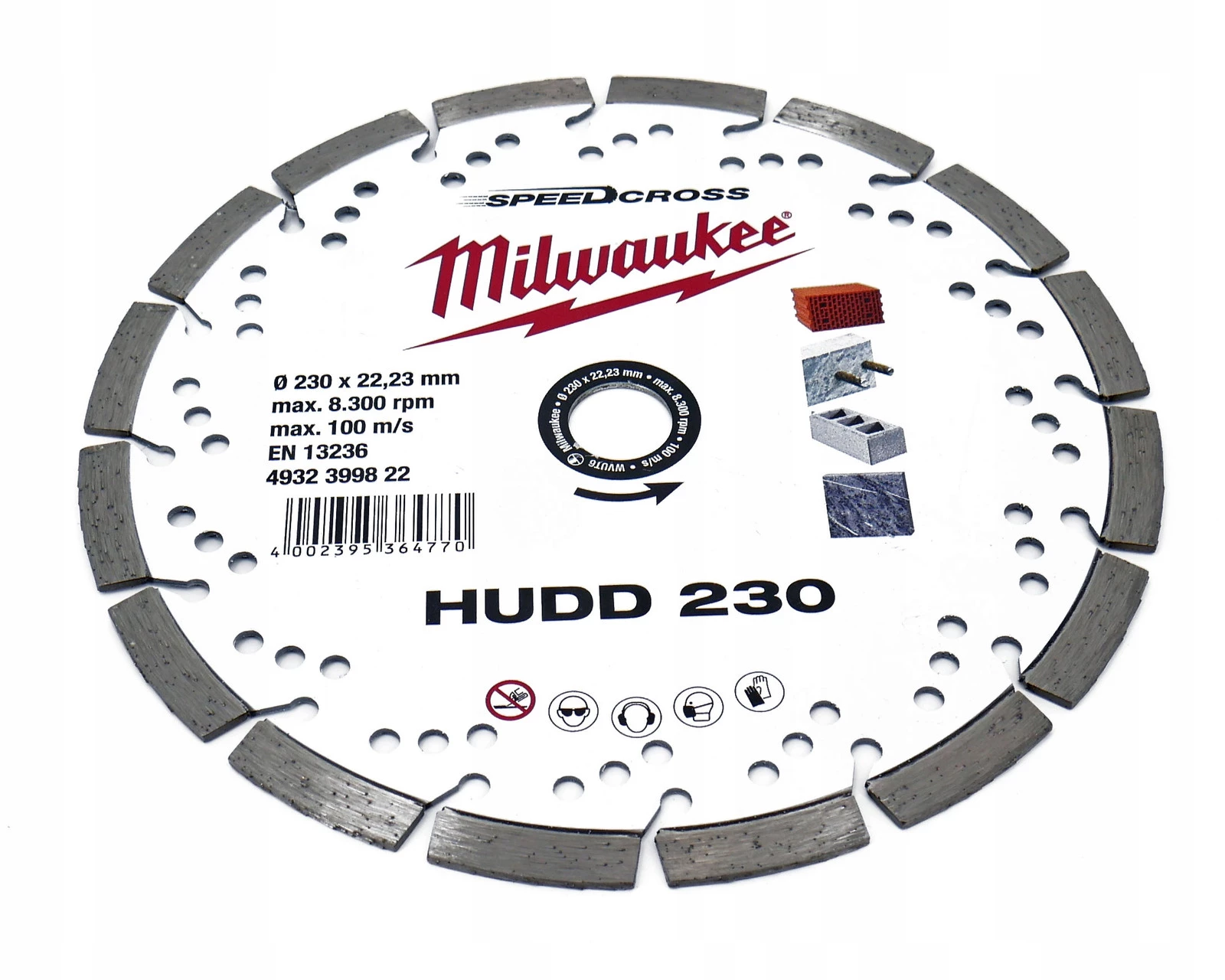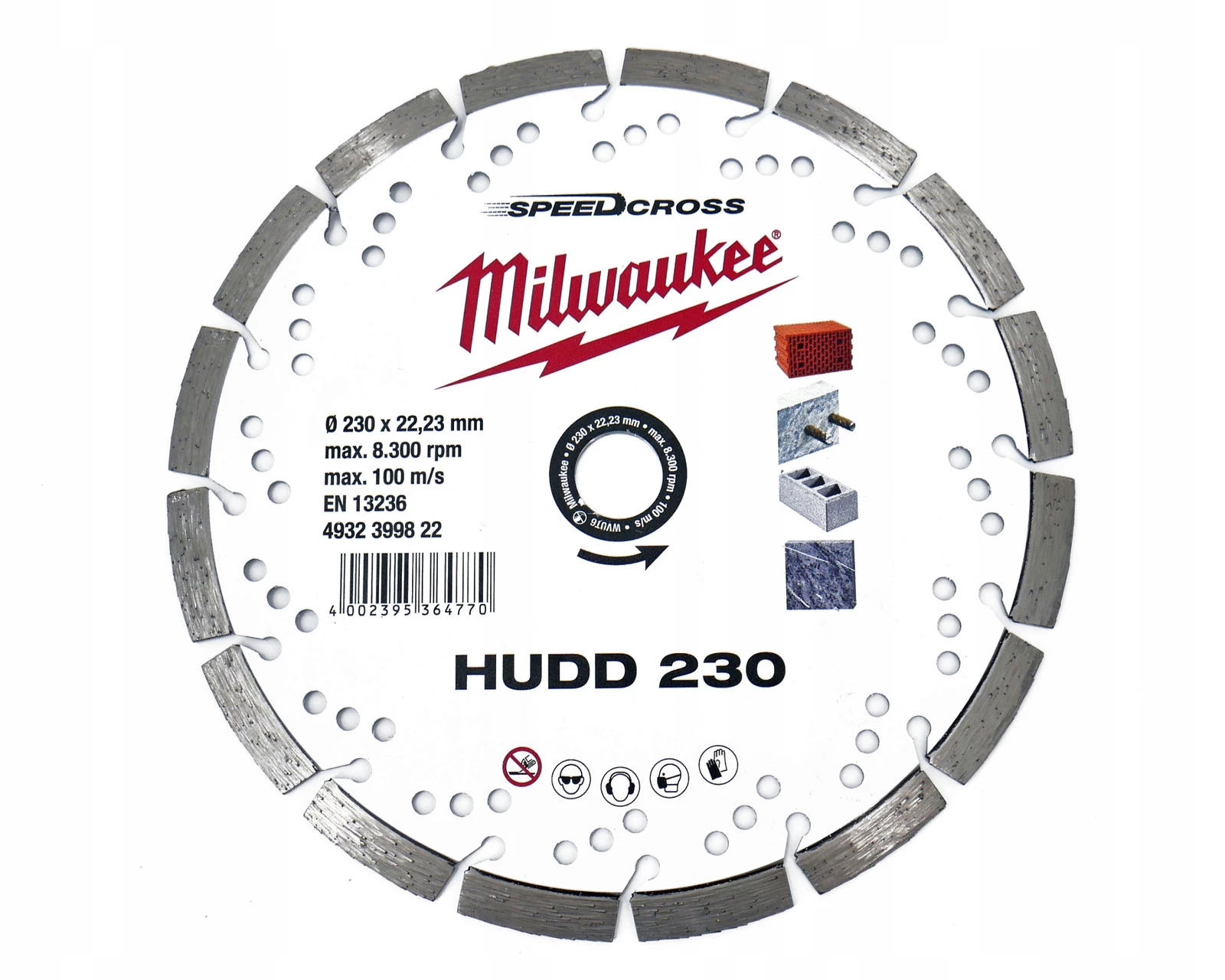 - Tarcza diamentowa Milwaukee SPEEDCROSS HUDD 230mm (otwór 22,23mm) do cięcia twardych materiałów budowlanych. Segmenty o wysokości 10mm spawane laserowo zapewniają maksymalną prędkość i żywotność. Niski poziom wibracji. Nr kat. 4932399822.