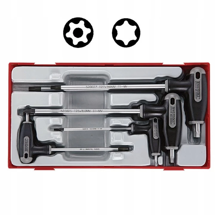 Teng Tools Zestaw 7 kluczy TX z rękojeścią poprzeczną. Do gniazd systemu TX (również z centralnym czopem). Dostarczany w tworzywowym pojemniku z odłączaną pokrywą, pasującym do skrzynek i wózków narzędziowych Teng Tools.