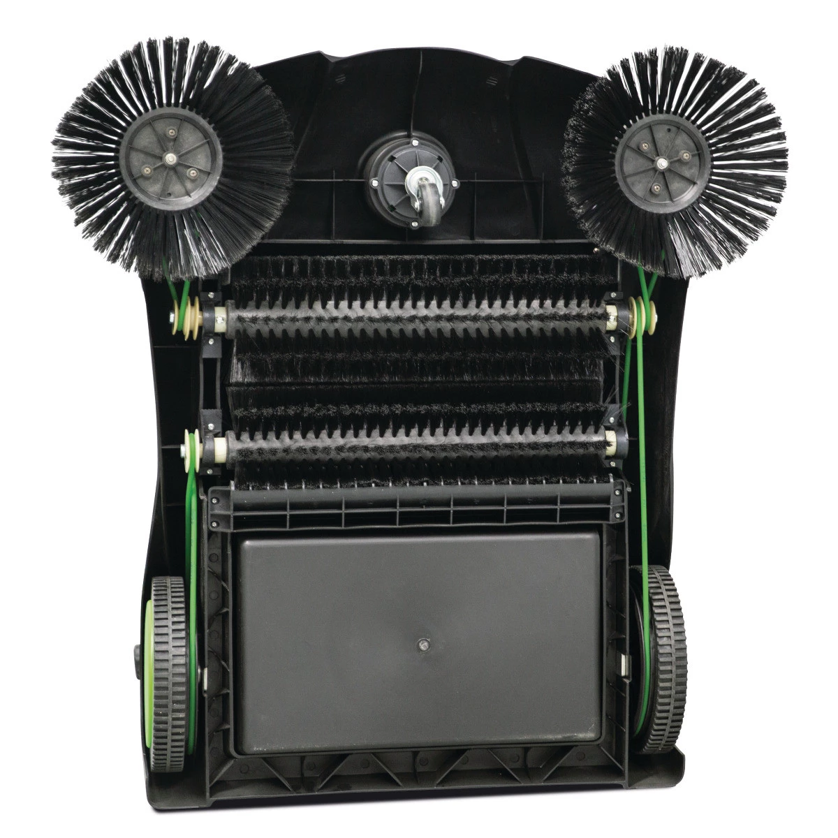 - Dwie szczotki boczne zamiatają gruz przed tandemowymi walcami zamiatającymi, które transportują go z góry do kosza